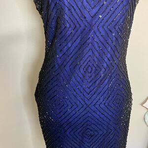 Sequin Dress This dress is stunning. It is a royal blue with a black beaded and sequined overlay. Please see all pics and video. Measurements are in pics and are all approximate. Volume up if you want to hear me talk. Does have a slit in the back. Please feel free to ask any questions. Thank you for shopping my closet :-)