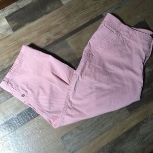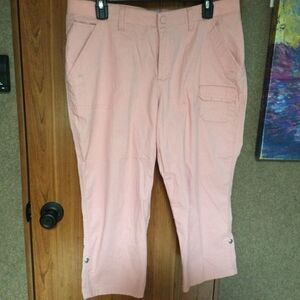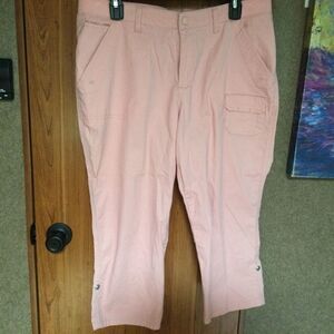 New without tag. Light shell pink 6-pocket cropped Lee brand jeans in women’s size 14P. Front zipper and snap. Relaxed fit. 3/4 of waist is elasticized knit. Inseam is approx. 20 1/4”. Roll-up tab at cuffs optional. Showing photos of front and back sides along with fiber contents info.