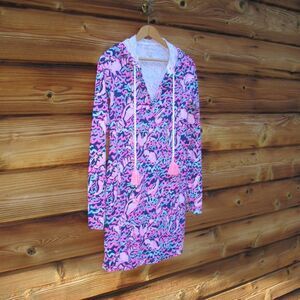 Size Small. UPF 50+ Beach Cover-Up Dress. Pockets. Hood With Tassel Drawcord. Side Slits. Machine Wash Cold.