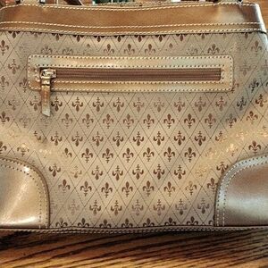 Tapestry fabric with fleur de lis. Vegan on bottom, bumpers, trim and straps. Center zip. Two side compartments with magnetic closures. Inside:one zip and two slip pockets. Side handles. Includes makeup/small case w/ mirror. Measures 12.5 long, 4.5 deep, 9 high, 11 inch drop from handles. Classic look, and NEW.