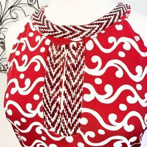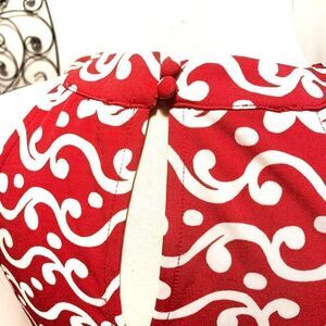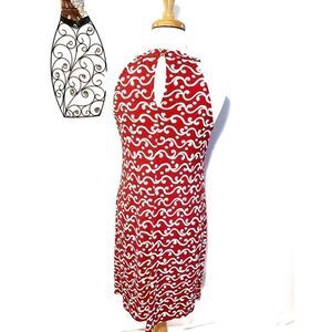 Light and airy Loft midi dress. Rounded neckline with button closure. High bare shoulders, slotted front with beaded accents sound it and the collar. White scroll and dot pattern throughout.