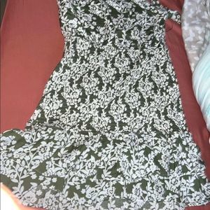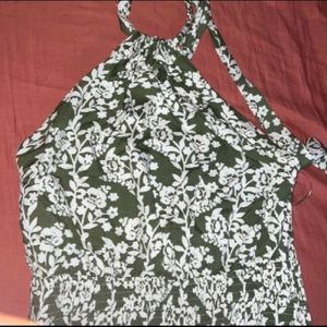 Our Olive Garden Dress is an olive and white floral print halter mini dress. This pretty features a smocked skirt and bottom ruffle tier.