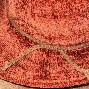 Stylish rust orange bucket hat. Perfect for casual outings. Braided leather strap around hat in brown. Very nice color