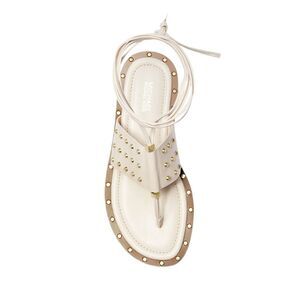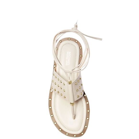 Keywords: Michael Kors, Jagger Sandal, studded sandals, leather sandals, beige sandals, flat heel, ankle wrap, buckle closure, casual sandals, summer footwear, women's sandals, new with tags.