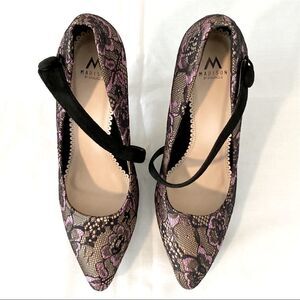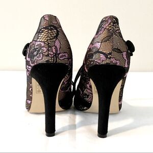 NWOT Madison by Shoe Dazzle Devany Black pumps with lace overlay with pink satin and button strap.