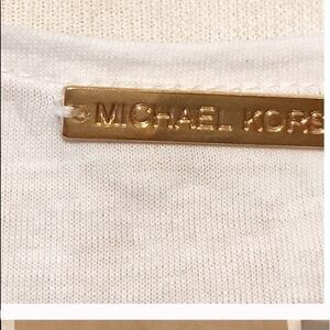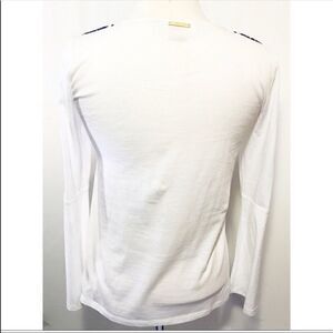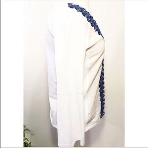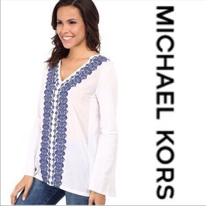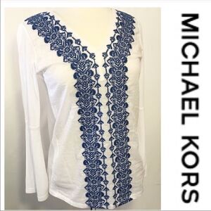 Long sleeve white cotton Michael Kors Top. V’d neckline in front and a blue embroidered pattern down the front.