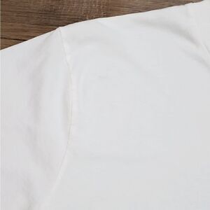 Never worn or washed. Factory flawed. Does have a few flaws; there are pen like marks on the front & a hole on the back. Both shown in last three photos.