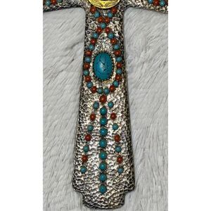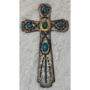 •Design and Materials: This cross features a textured, stony appearance with inlaid faux turquoise and colorful gem-like accents. The central horseshoe adds a distinctive Western or cowboy-themed element. Many such crosses are made from durable polyresin and are hand-painted for detail.
