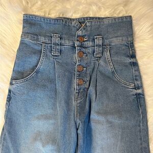Can you feel it? Super high-waisted jeans with a wide leg, stacked, pleated waist, exposed button fly and a long 32-inch inseam with a clean hem. Made from a recycled-denim blend with a touch of stretch, Love On The Beat is a light blue wash with whiskering and fading. Made in Los Angeles.