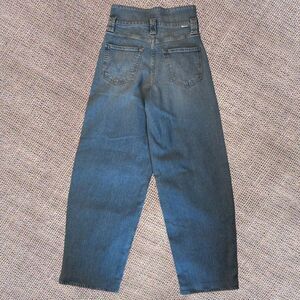 Crafted from a recycled-denim blend with a hint of stretch, these super high-waisted wide-leg jeans offer a contemporary take on timeless style. Featuring a stacked, pleated waist and an exposed button fly, they contribute a chic silhouette with a 32-inch inseam. The light blue wash includes flattering whiskering and fading, making them a versatile addition to any wardrobe, ideal for both casual outings and elevated events.