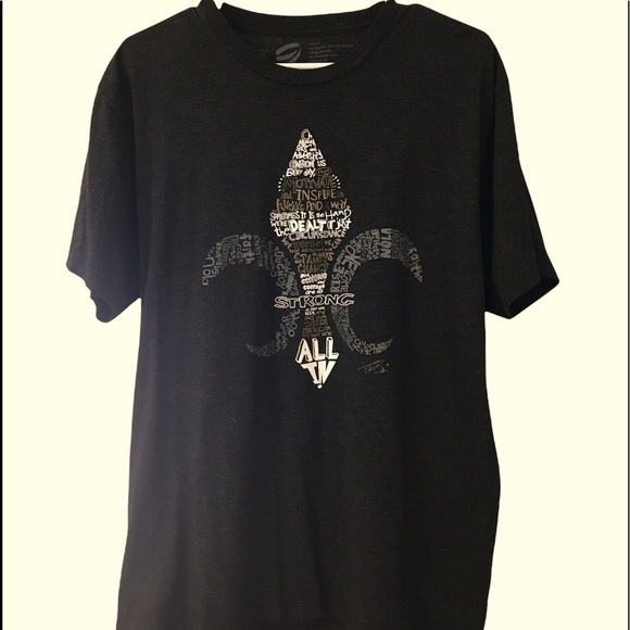 NWOT Drew Brees “ALL IN” T-shirt with Flur de Lis design filled with motivational sayings from Drew Brees NINE Brand apparel collection. Has Drew Brees signature.