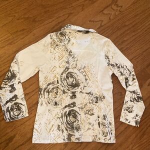 NWOT Parsley & Sage button down shirt, or could be a jacket, with some lace in different areas, call, metal buttons, gray, black, gold, and white M (775