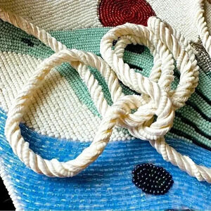This beautiful vintage bag is fully covered in beads, the strap is also covered in beads with a rope like material.