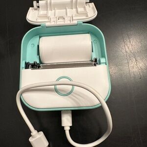 NWOT-Print Pod in teal blue, charging cord, and 6 rolls of print paper. Never been used. Download the app to create your customize labels from your phone. You can choose different fonts, printing pictures & more! Paper is self adhesive. Meet the Print Pod ™,the world's most convenient This little device allows vou to print anvwhere,