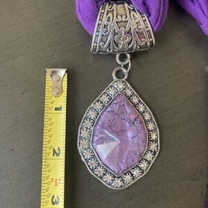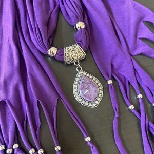 NWOT Beautiful boho purple and silver beaded fringe scarf accessory with lavender lilac faux stone pendant. Can be worn as a scarf, wrap, belt, etc.