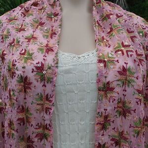 NWOT RAJ Pink & Multicolored Embroidered Stars Sequins Silk India Scarf/Wrap