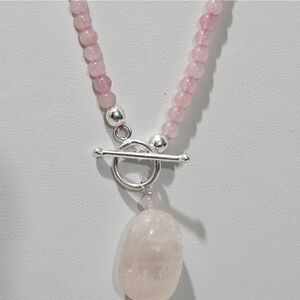 Smaller beads lead to a sterling silver toggle clasp and then a large rose quartz at the bottom. The large stone measures almost 1 inch.