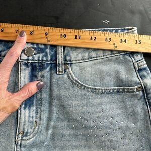•Crystal embellishments throughout. And Single crystal on back belt loop as shown