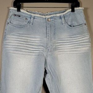 These pale blue denim jeans from Revolt Jeans have decorative folds going down the front, glitter all down the front and back, and silver studs on the front of the lower legs. They have raw hems at the waist and cuffs. Zip up with rivet button closure. Content: 96% cotton, 4% spandex. Care: machine wash, tumble dry.