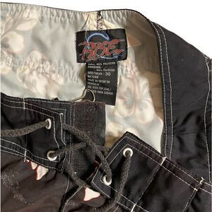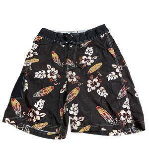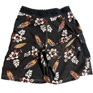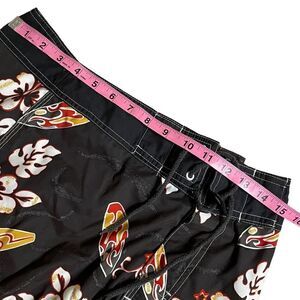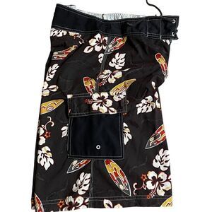 NWOT Rise Hawaii surfboard Board Shorts. Black with white, red and gold tropical flowers and surf boards.