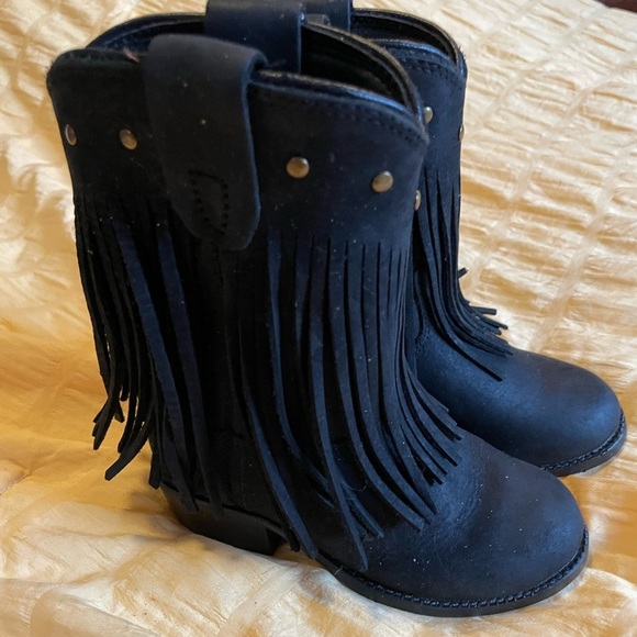 Add a touch of wild west flair to your little one's outfit with these NWOTS fringe leather boots from Old West. These slip-on boots are perfect for baby girls, and feature a black color with studded accents and fringe detailing. The boots are made from high-quality leather, ensuring durability and comfort for your little one. These boots are perfect for any cowgirl themed party or outfit, and are sure to make a statement. The size 4C boots are a rare find, and are perfect for toddlers. Complete your little one's western look with these stylish and comfortable boots.