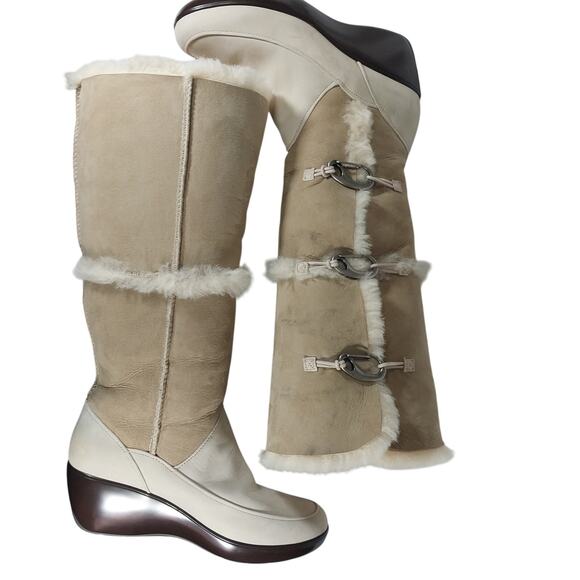 From Sperry, (the maker of Top Siders), come these awesome warm winter boots in cream and fawn beige NUBUCK FINISH genuine leather! Plus, natural, genuine shearling lining! Triple buckle detail, wedge heel, genuine Sherpa style! Rubber sole! 2.5" heel, 14.5" shaft height, 16" shaft circumference at calf! Size 7.5M, Tagged at $144.99, sale price! ***Brand NEW! New WITH Tags, and Guaranteed Superb by Lily @HauteClub!* *Condition Note: the right boot has a lightly smudged area, upper near the buckle, plz see pix, Otherwise excellent,!