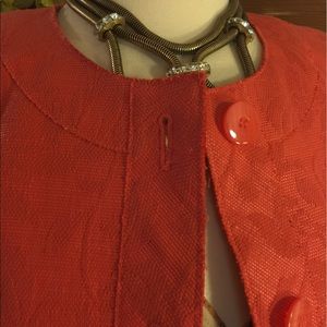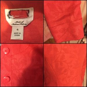 BEAUTIFUL ITALIAN MADE BLAZER/JACKET. RETAIL $225. TEXTURED LEAF PRINT-A COMBO SALMON-CORAL-BUTTON UP. 21" LONG; 23" SLEEVES. SZ 4-ACTUAL MEASUREMENTS LYNG FLAT: 18" BUST; 15.75" WAIST; 18" HIPS. SHELL: 51% COTTON/ 28% VISCOSE/ 21% NYLON. CORAL LINING: 100% POLYESTER. PURCHASED AT AN OUTLET A FEW YEARS AGO-NEVER WORN. PLEASE DO NOT HESITATE TO ASK ANY QUESTIONS! #nwot #italianmade #texturedcotton #leafprint #salmoncoral #blazer #jacket