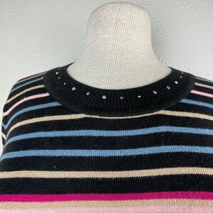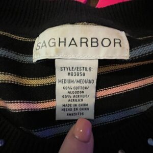 NWOT Sag Harbor beautiful multicolored crew neck sweater. It features multicolored rhinestone around the neck. It measures 37 inches in length and 20 1/2 inches armpit to armpit. In excellent condition.