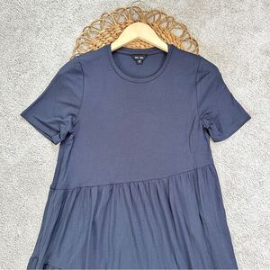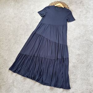 A comfortable, tiered dress in navy made with the softest jersey for an easy look and feel for all the seasons. We designed this style with flattering, asymmetric tiers and used a soft and sustainable viscose fabric with a beautiful drape (and a little stretch). It has a soft and silky hand feel and a relaxed fit. Pair easily with sandals in the summer. Sneakers or boots in the winter and with heels for a smarter look for work or nights out.