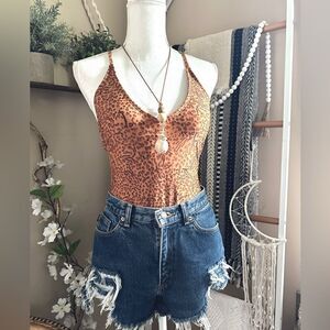 New without tags. One piece plunge swimsuit in leopard print. Has side tie ruched detailing to adjust fit. Removable cups and crisscross back with tie closure also makes it easy to adjust the upper fit as well. Could also double as a body suit! Size small - see shade & shore size guide in listing for measurements.