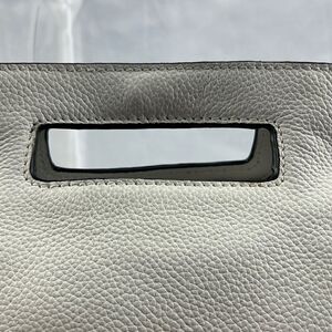 This gorgeous white tahari bag has a unique handle at the top is leather it has a button pocket in the back and a zipper pocket inside it is a button close bag