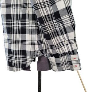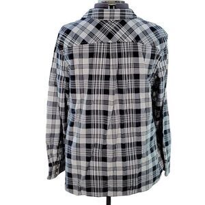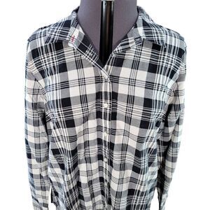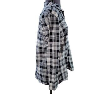 This black & white plaid button down shirt has metallic thread high lights throughout. All buttons present. Includes extra buttons. Content: 98% cotton, 1% metallic, 1% other fiber. Care: machine wash, tumble dry.