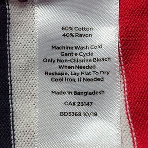 This short sleeve knit top from Talbots has wide horizontal stripes in white, red and black. Content: 60% cotton, 40% rayon. Care: machine wash, lay flat to dry.