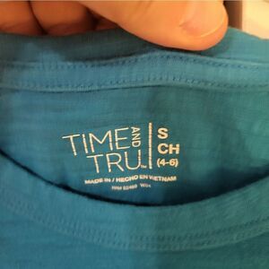 NWOT Time and Tru blue short-sleeved tee, size S (4-6), 60% cotton 40% recycled polyester, excellent unused condition.