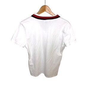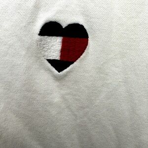 Classic Tommy Hilfiger polo shirt in crisp white with stylish red and navy striped collar detail. Features an embroidered Tommy Hilfiger heart logo on the chest and a button-up front. A timeless, preppy look perfect for casual wear, golf, or layering.