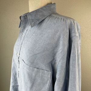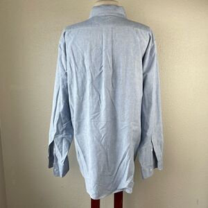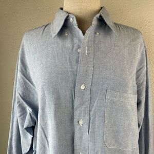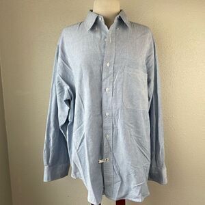 Classic light blue button down great for casual or professional wear. It measures 22 inches across the chest laying flat and is 30 inches in length from shoulder to hem.