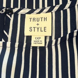 NWOT Truth + Style Mavy & White Chiffon Tunic Sz 1XP. Material, care, and sizing chart in photos. Measures 15” armpits, armpit, and.41” long.