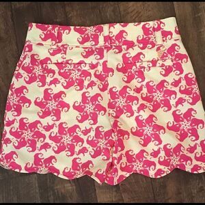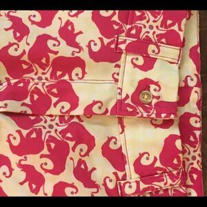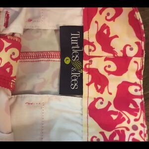 Really cute shorts with pink elephants and yellow and white background. Waist is 28” adjustable inside to a smaller size. Inner seam is 9” and 12 1/2” from waist to hem.
