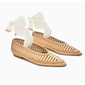 Perfect for casual and formal events, these beige flats come with lovely ribbon ties that can be removed and rest on a slight heel. Composition: 100% Calfskin Women's Ophelia Flat in Sand Msrp -$590