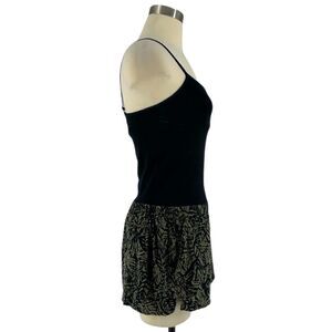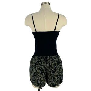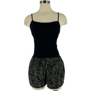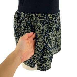 silence + noise by Urban Outfitters. Pull-on shorts in black base and olive green botanical print. Side pockets. Side slots. Elastic waistband. Quality material is soft and breathable. Perfect for summer. Pairs best with beige boho top or fitted blank top. Discontinued style. Smoke-free and pet-fee home.