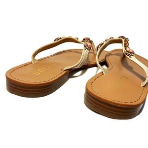 Brand new pair of bejeweled Unisa sandals. Beige colored strap with adorned with faux coral, clear gemstone with gold metal.