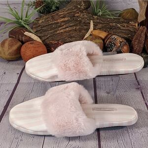 Victoria's Secret Signature Satin Slippers Pink Stripe with Faux Fur