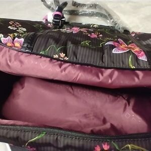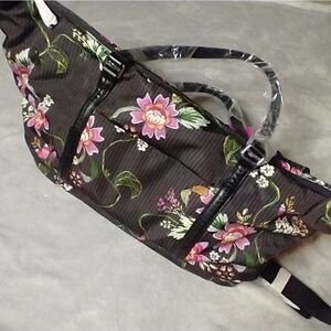 Approximately 18.25" w x 16.0" h x 10.25" d with 10.5" strap drop. New without Tags. No rips, tears or stains. One of the bottom leather pieces has an indent as shown in the picture. Comes with adjustable and removable strap. Water resistant. Little lock and key also included. Smoke free/Dog friendly home.