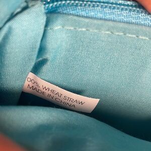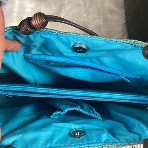 Lining is a beautiful blue color with zippered pocket and other pockets as well