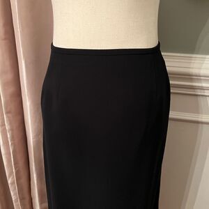 Size 10P Skirt in Black with Invisible Back Zip Closure and Back Vent, Measures 15.5" Across the Top of the Waistband and the Length Measures 23.75" from the Top of the Waistband to the Edge of the Hemline