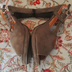 NEW These pretty heels are a lovely sage green. Covered heel. Latch strap that looks like a buckle, but easier. There is no leather label. .5 inch platform. Size 8.5 measures 10 long on foot bed. 4 inch heel over a .5 inch platform. So wonderful!