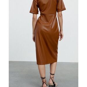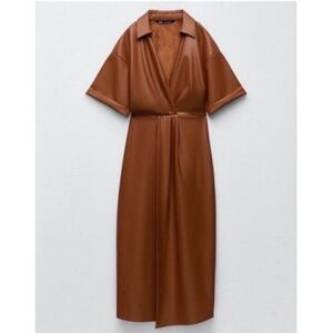 NWOT ZARA FAUX LEATHER SHIRT DRESS MIDI BROWN MEDIUM