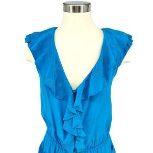 Flowy bright romper in teal/turquoise/aqua. Beautiful ruffles with floral embroidered eyelet detail along deep collar, sleeves, and upper back. Button down closure with 7 buttons (tightly sewn with not a single one loose). 100% silk material is breathable and lightweight. Perfect for summer. Super cute with hair in an updo. Discontinued style. Smoke-free and pet-free home.