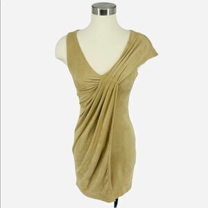 Elegant suede bodycon dress in natural beige / tan. Beautiful waterfall drape on front of dress. Cap sleeves are slightly ruched. Nude slip sewn underneath dress. Super soft material. Can also wear with a skinny belt (tan snakeskin). Pairs well with leather sandals. Discontinued style. Smoke-free and pet-free home.