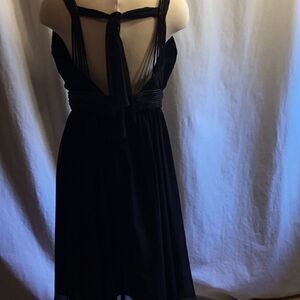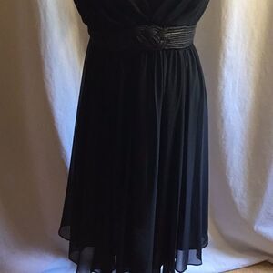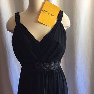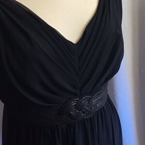 Beautiful sleeveless cocktail dress by RM RICHARDS in size 12. Black with full matching lining. Belt & sleeves braided with gold throughout. Sashes in back tie to middle of back on top. NWOT. Back zipper. Measurements are as follows: bust 38”, waist 30”, hips 38”, length 39 1/2”.
